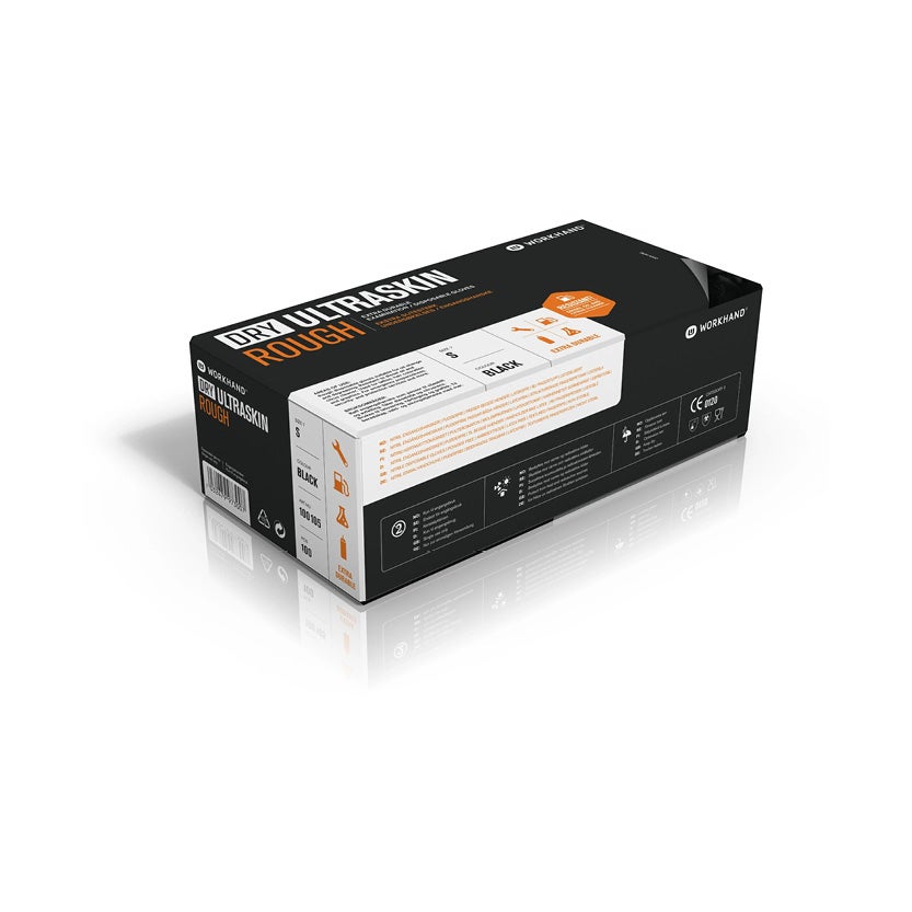 Skydda dina händer med Ultraskin Rough nitrilhandskar – robusta, svarta engångshandskar som klarar tuffa miljöer. Dessa puderfria nitrilhandskar är motståndskraftiga mot olja, fett, diesel och citrussyra, vilket gör dem perfekta för industri, fordonshantering, verkstäder och livsmedelsindustri.